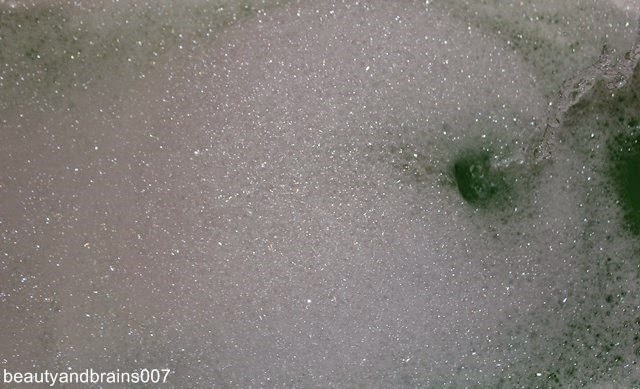 It has a bit strong and spicy scent, but also soft at moments, thanks to the yellow part on top, which smells like the moon on Christmas Eve bubble bar (review here). I smell cinnamon the most. It is covered in silver and blue glitter, but only on surface, the inside is green as Hudson river on St. Patrick's day. When I first tried it, it reminded me of Grinch (but from the part when he became good) and the movie "Elf".